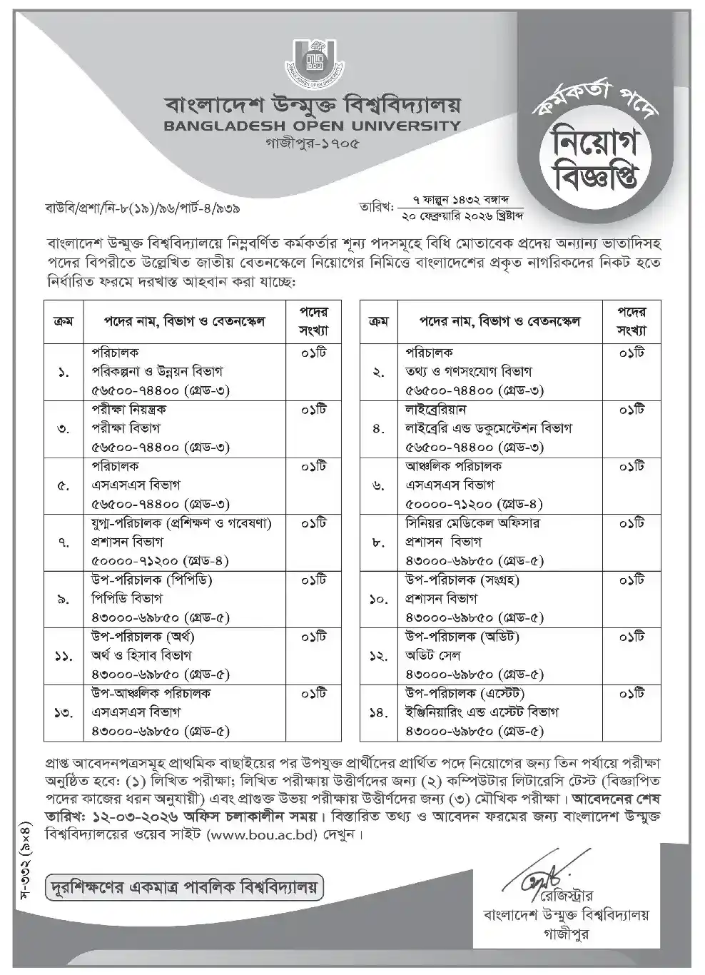 ২৩ ফেব্রুয়ারি ২০২৬ তারিখে প্রকাশিত বিজ্ঞপ্তির আবেদনের শেষ তারিখ ১৪ মার্চ ২০২৬।