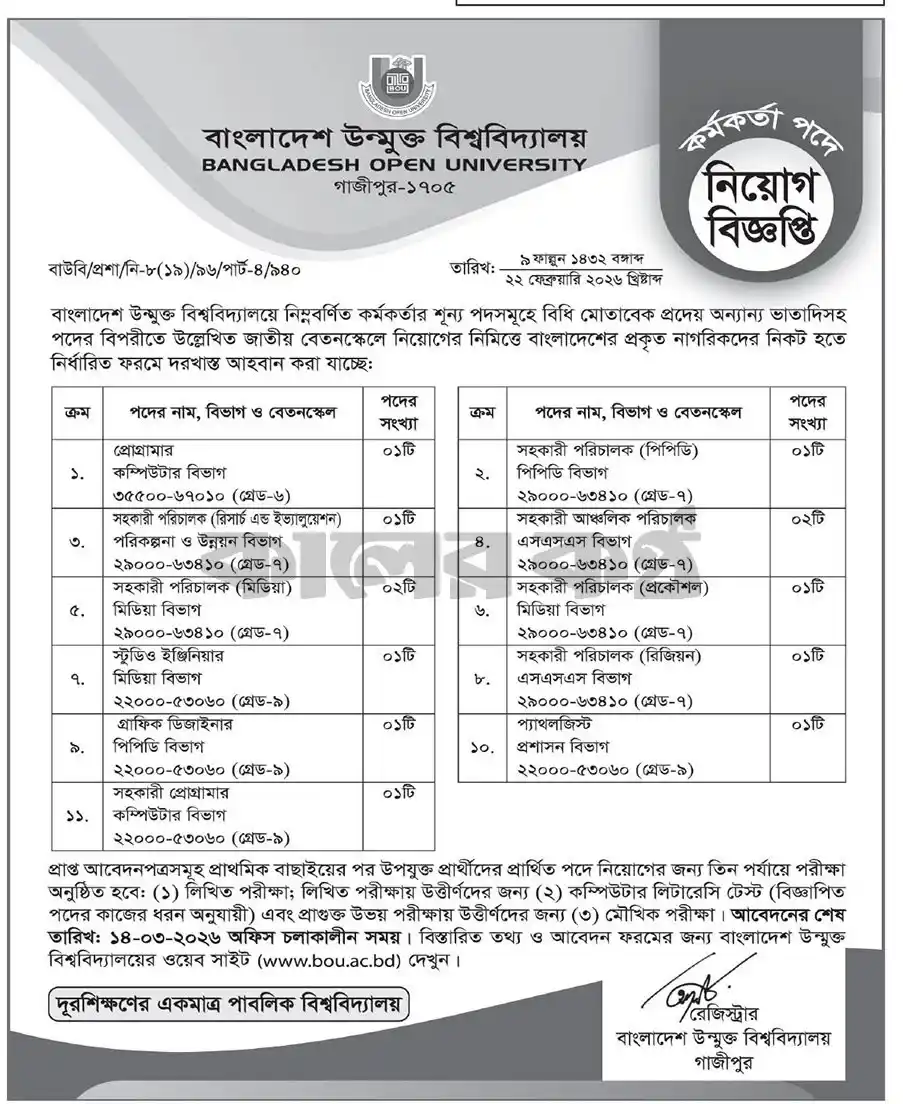 বাংলাদেশ উন্মুক্ত বিশ্ববিদ্যালয় নিয়োগ ২০২৬