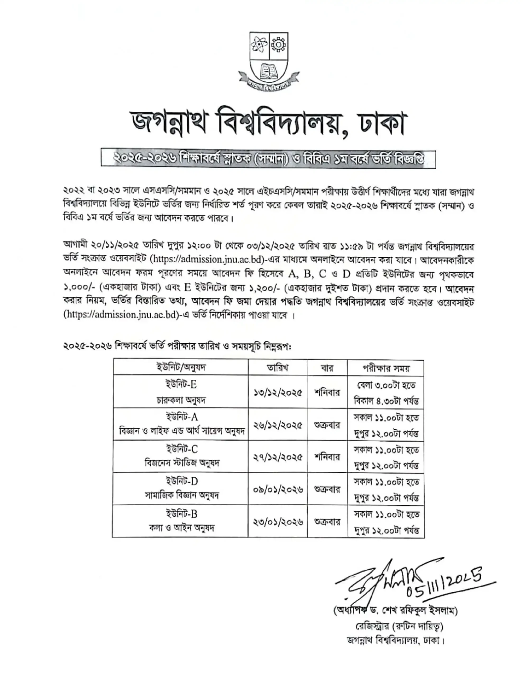 জগন্নাথ বিশ্ববিদ্যালয় ভর্তি সার্কুলার ২০২৫–২৬ মূল তথ্য