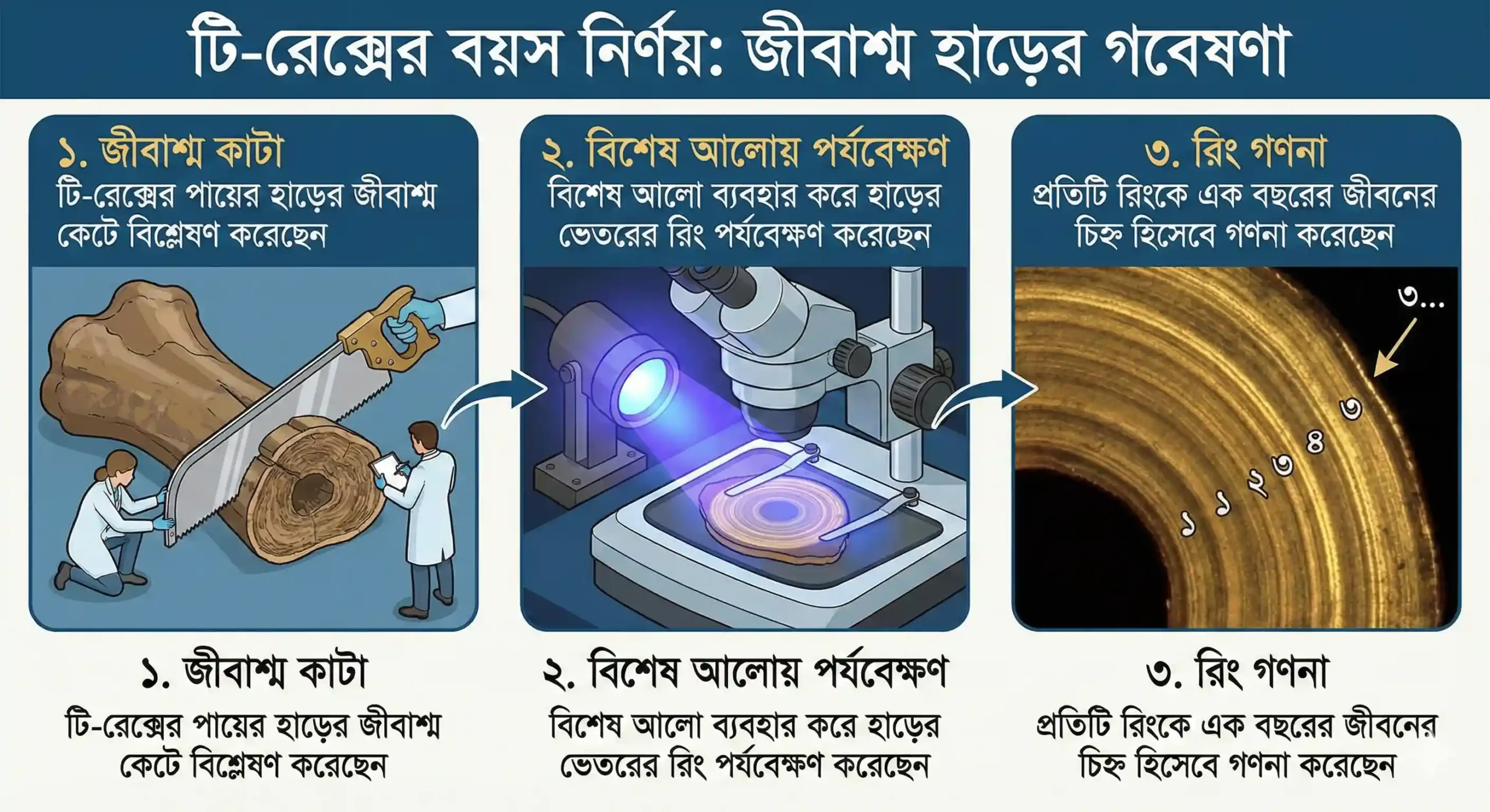 গাছের কাণ্ডে যেমন বর্ষবলয় থাকে, ঠিক তেমনই টি-রেক্সের হাড়েও বৃদ্ধি বলয় পাওয়া যায়।