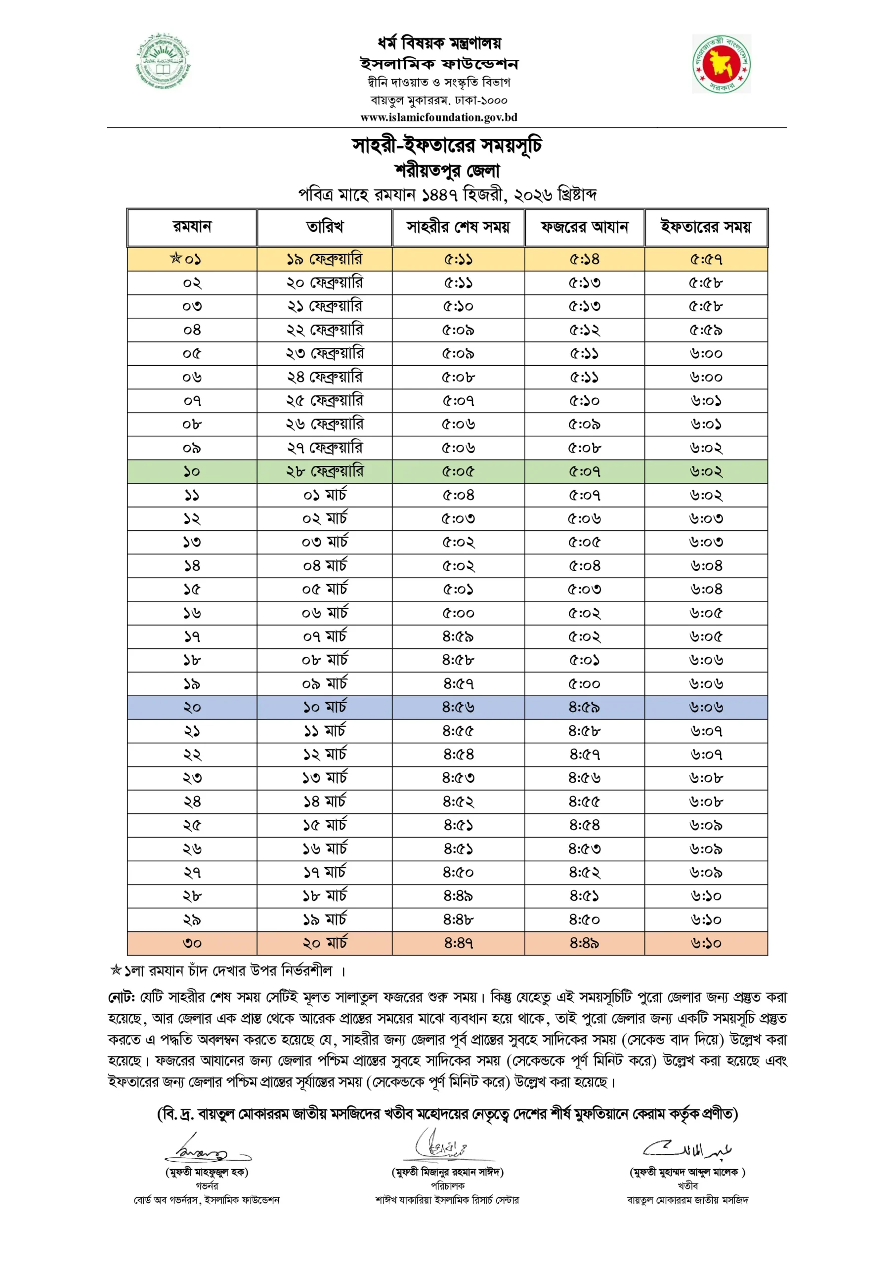 এই সময়সূচি রোজাদারদের জন্য গুরুত্বপূর্ণ কারণ এটি পুরো মাসের রোজা পরিকল্পনায় সহায়তা করে।